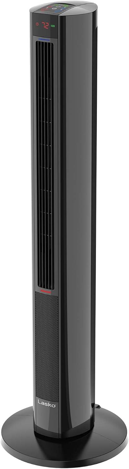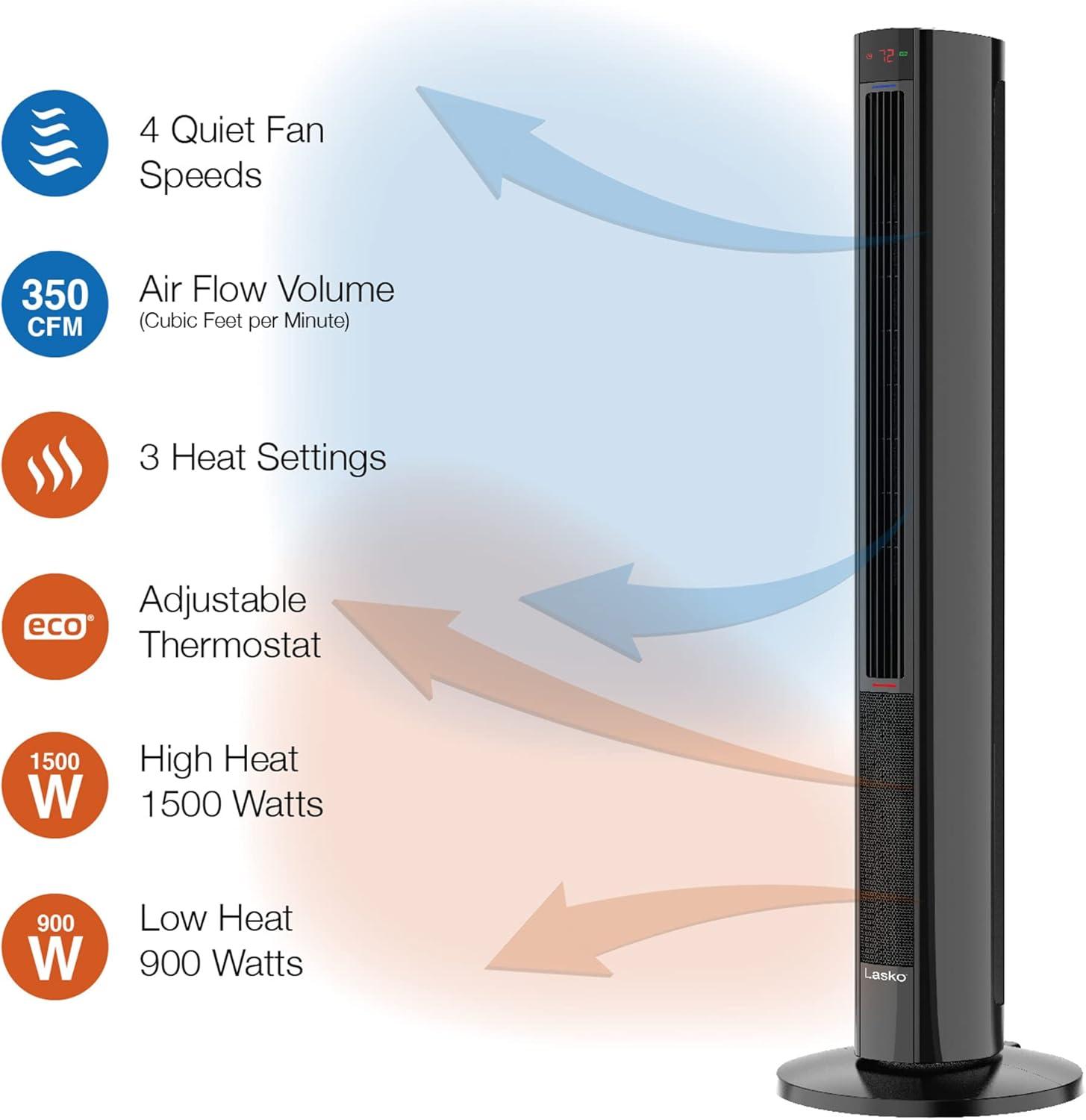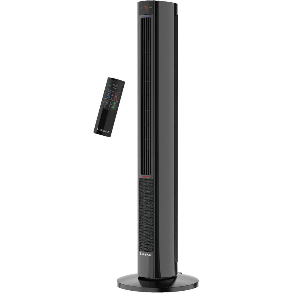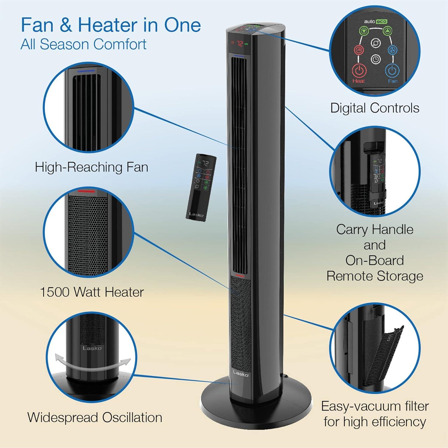 Lasko 1500W Oscillating All Season Tower Fan and Space Heater w/4 Quiet Fan Speeds, 3 Heat Settings, Auto-off Timer, & Remote for Home & Office, Black(Black)