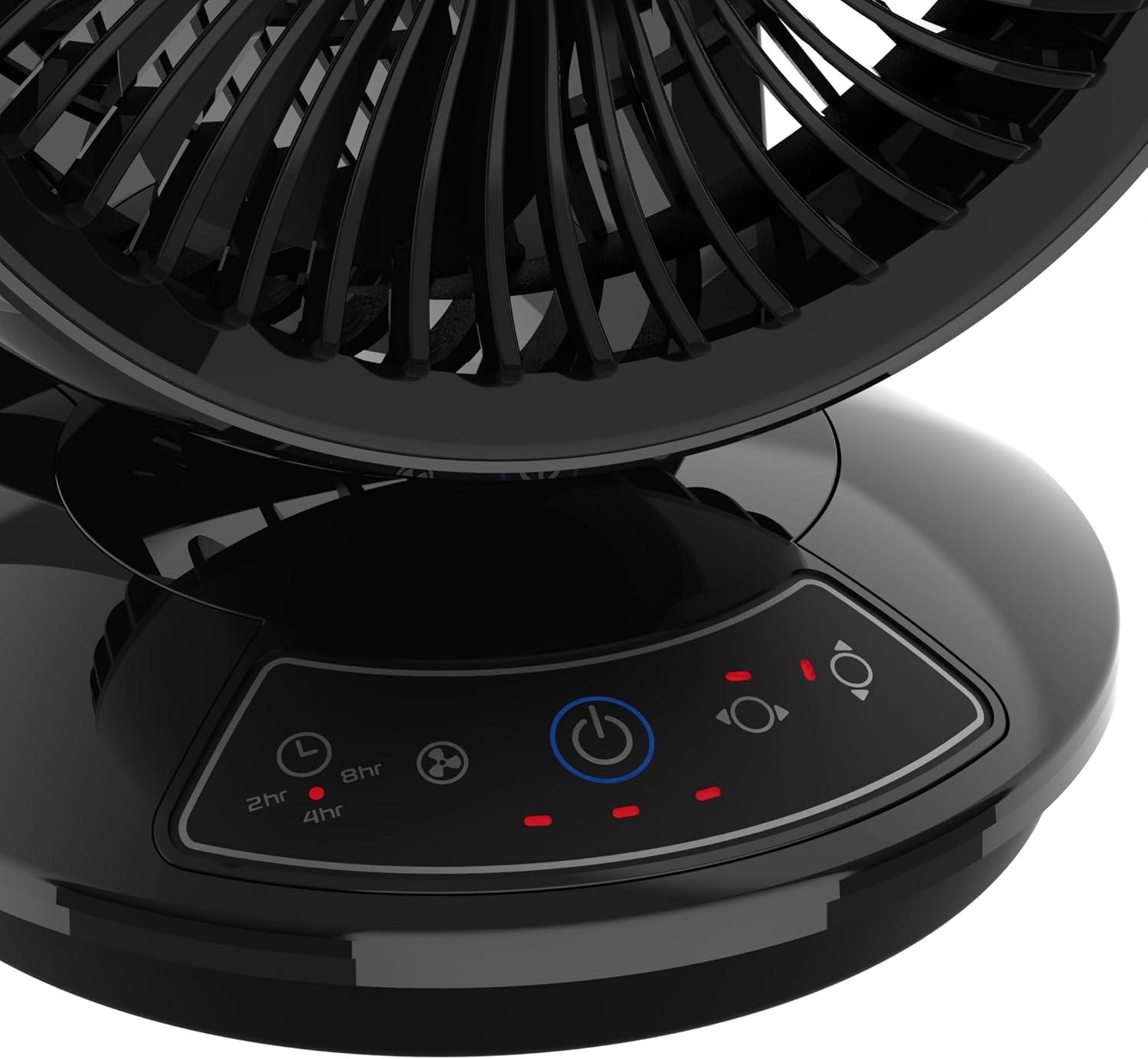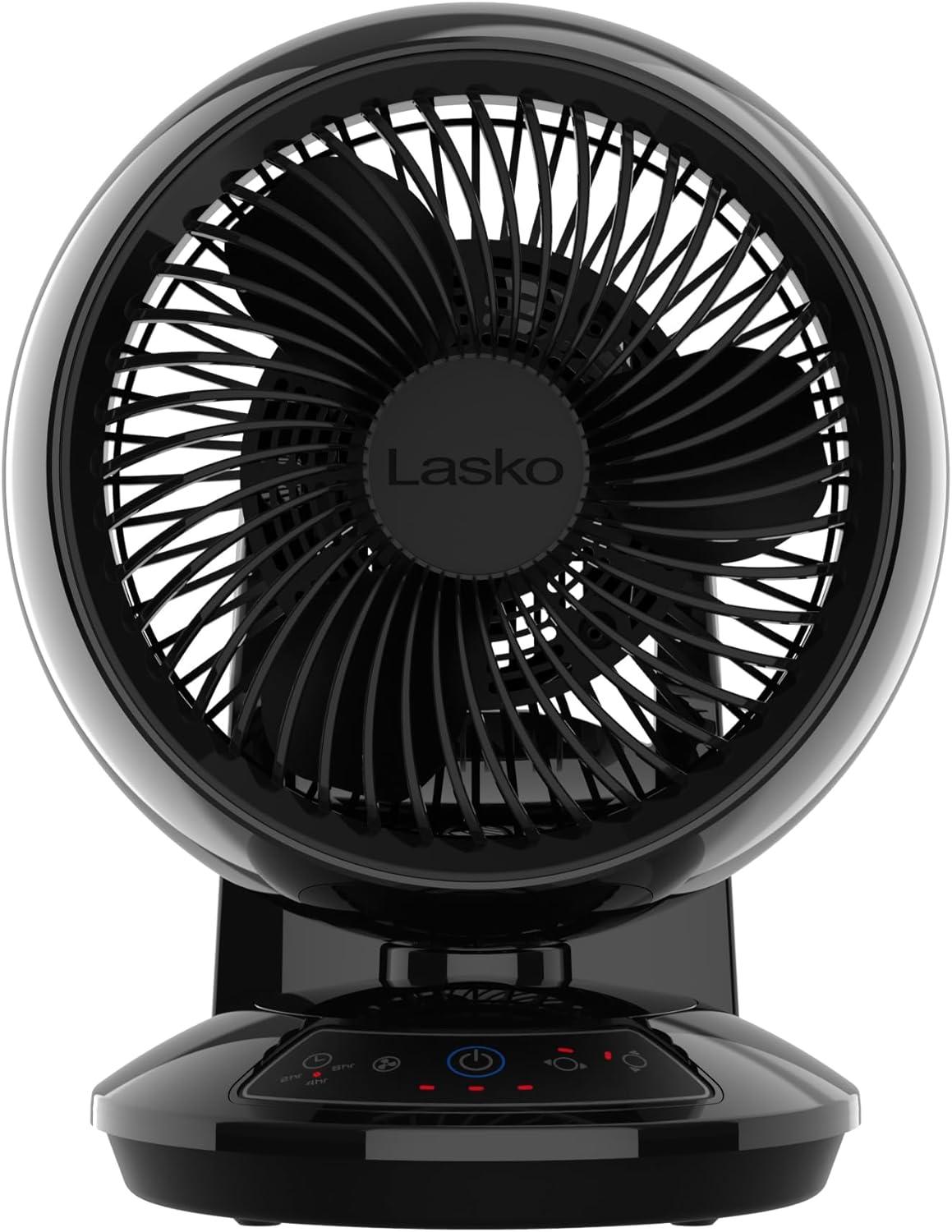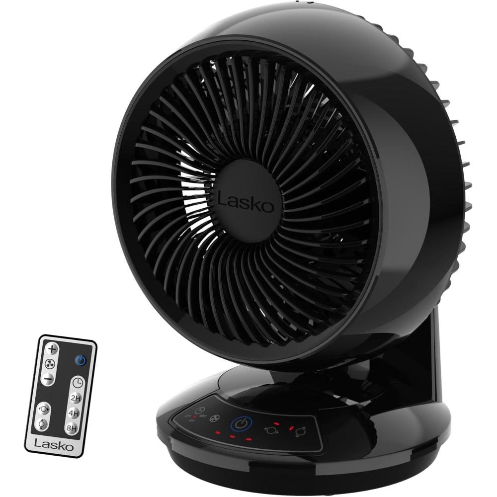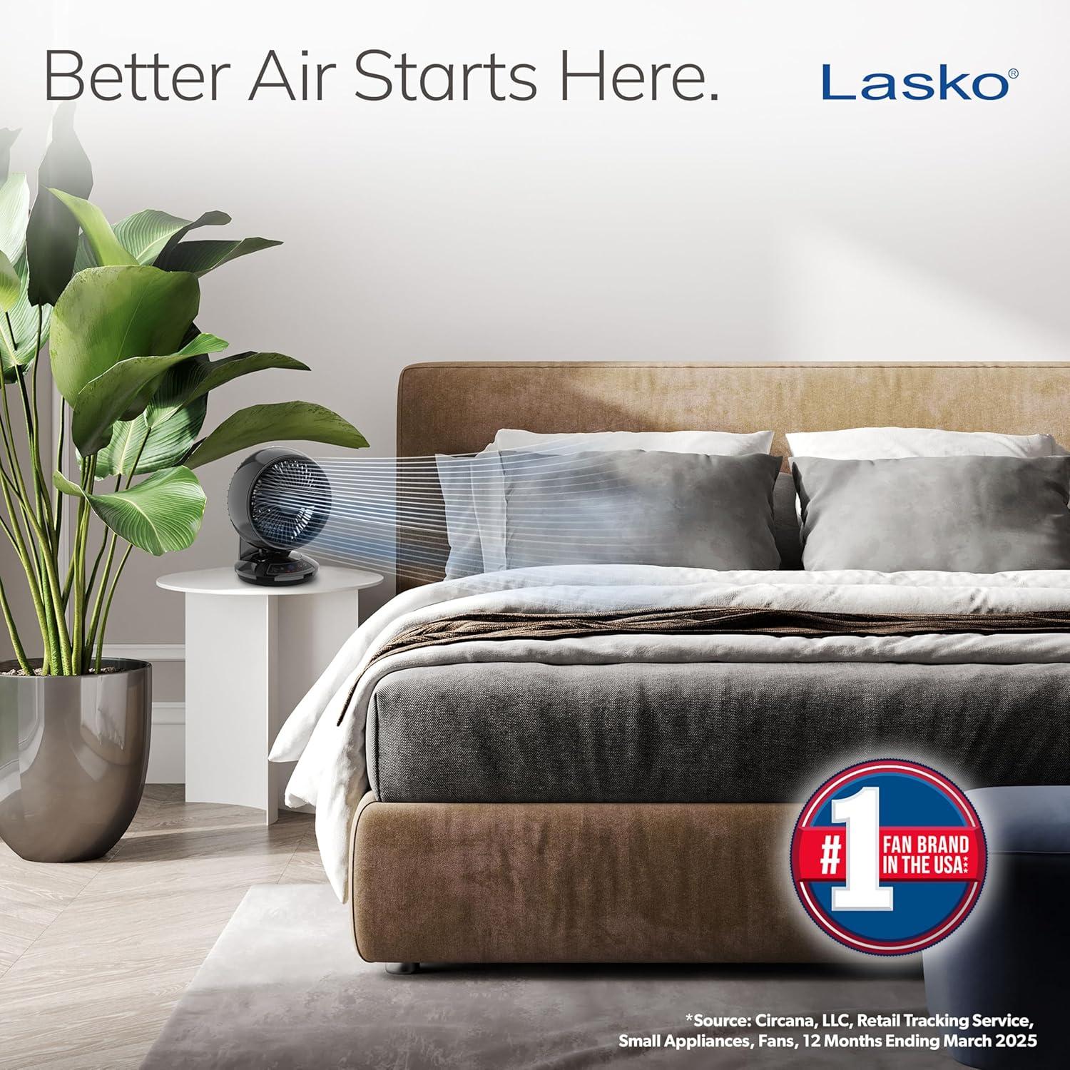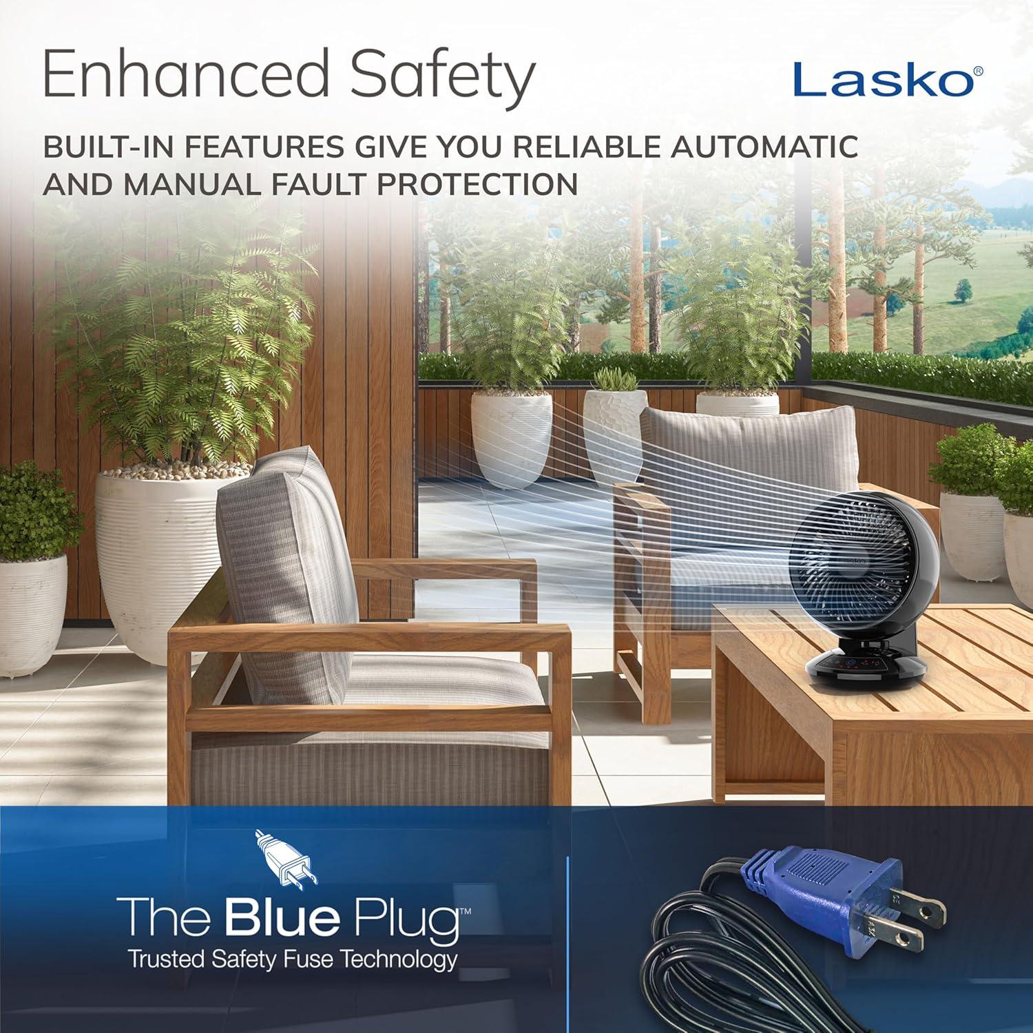 “The Lasko Whirlwind Orbital Motion Air Circulator Table Fan is a versatile solution for those seeking room fans for bedroom cooling. It offers a unique orbital motion, allowing the fan to oscillate vertically and horizontally, or both, great for small and medium-sized rooms. With a 60° horizontal swing and 90° by 60° orbital motion, this fan provides thorough circulation, making it a great choice for a small room fan or even as an office fan. Despite its compact size, this powerful fan moves air up to 1150 feet per minute, circulating it up to 25.6 times per hour in a small room and 13.1 times per hour in medium-sized rooms. The fan includes three refreshing speeds, easily adjustable to cater to your comfort, from gentle to strong gusts. Its Dark Mode feature dims the display lights after 5 seconds. This tabletop fan comes with a remote control, allowing you to operate it from across the room, making it ideal for those who value convenience. Additionally, the remote storage at the back offers easy access, making it a great choice for desk fans and small desk fans. Equipped with Lasko's Trusted Safety Fuse Technology, the Blue Plug provides safe operation. Great as a table fan for bedrooms, a standing fan with remote, or a small oscillating for small or medium-sized rooms, this fan combines function and innovation seamlessly. The Lasko Whirlwind fully embodies versatility, whether as a mini fan for a desk or a stand-up fan, providing effective cooling solutions in a variety of settings.”