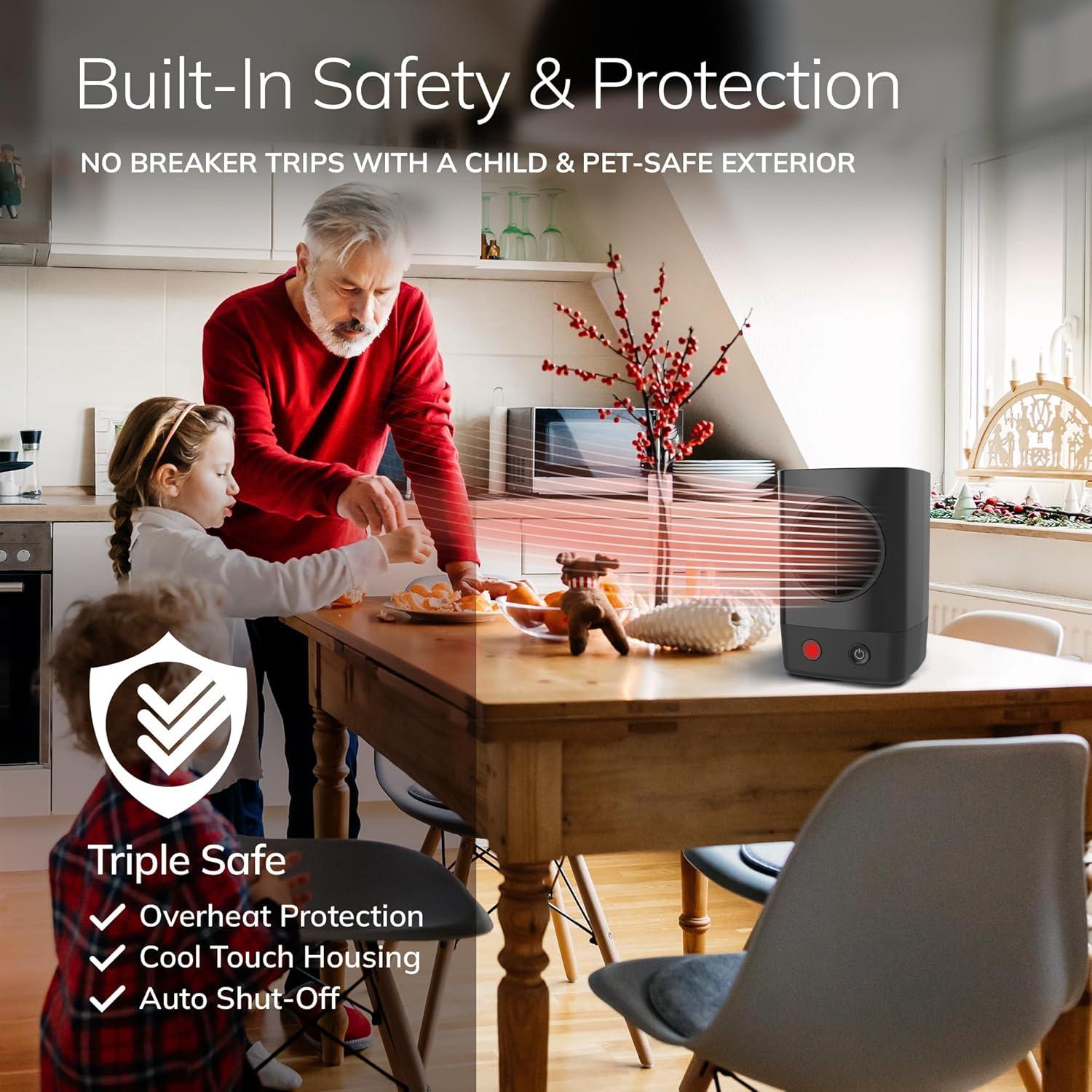 Introducing the Lasko 200 MyHeat™ Mini Personal Ceramic Heater in sleek black – your perfect companion for staying warm any season. Designed with energy efficiency in mind, this personal space heater operates at 400 watts, ensuring you stay warm while keeping your energy consumption low. Your personal heater will focus on you, not the room. This eclectic heater is perfect for placing on your table, desk, or even under a desk, providing a steady stream of warmth all day long. With no assembly required, simply unbox, plug into a standard 120v wall outlet, and flip the switch to enjoy instant heat. The MyHeat Mini is not only efficient but also user-friendly. The 6-foot power cord and 2-pronged plug make it easy to reach the nearest outlet. Compact and portable, it's effortlessly stored when not in use. The ceramic heating element heats up swiftly, and the built-in fan quietly disperses warm air. Experience the convenience of simple on/off manual controls that are easy to use, providing comfort at your fingertips. Whether you're battling the winter chill at work or trying to escape the summer breeze near an AC vent, the MyHeat Mini ensures year-round comfort. Take control of your personal climate with this versatile heater. Your safety is our priority. The MyHeat Mini is ETL Listed and equipped with Overheat Protection, a cool-touch exterior and a safe ceramic element, allowing worry-free use for extended periods. Comes with a 3-year limited warranty.