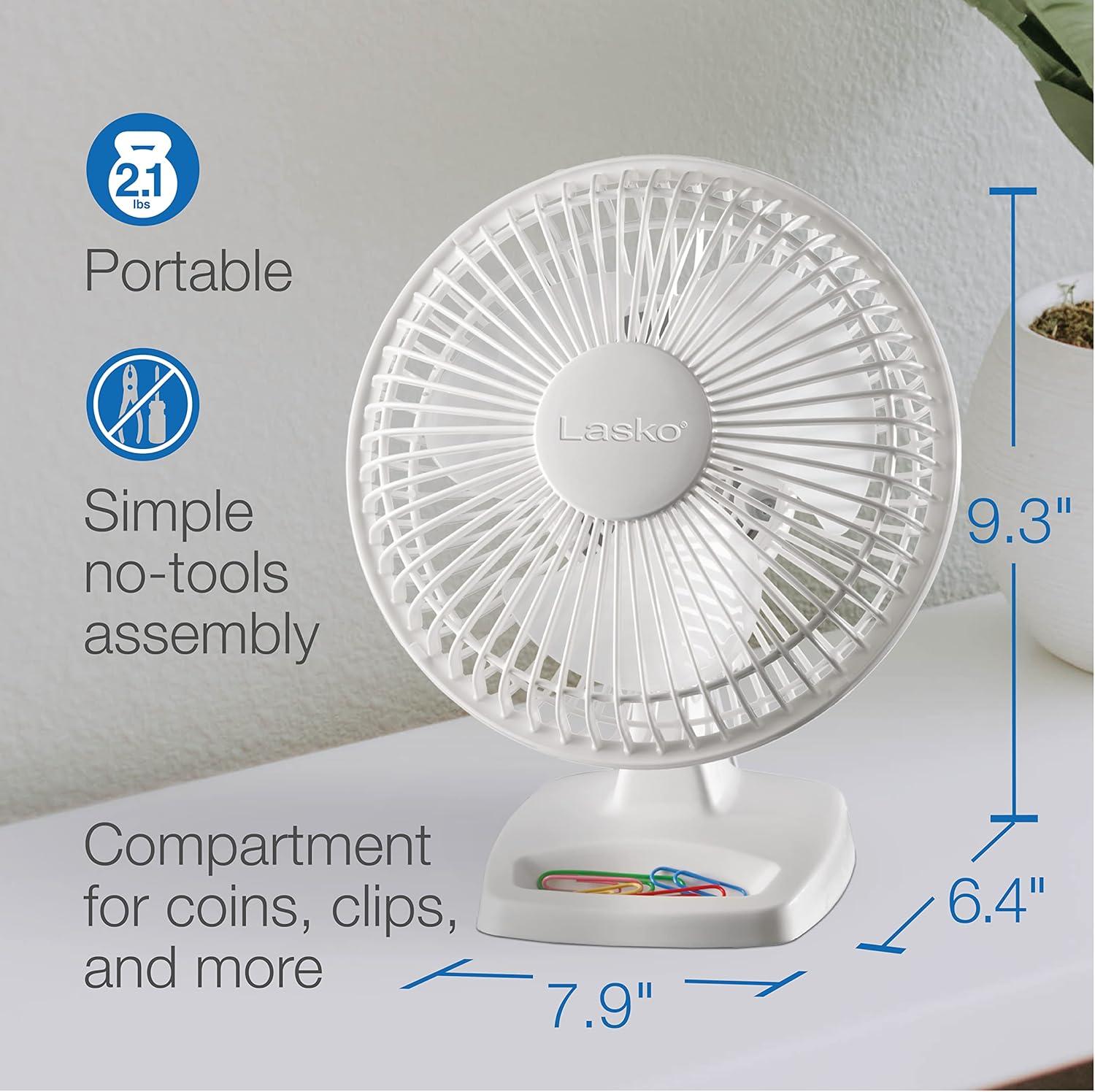 Lasko's quiet No. 2002W 6-inch Personal fan tilts and pivots to direct air flow where needed for cooling comfort. Made in the USA from Domestic and Imported Parts. Lasko; 100+ years of quality, comfort and durability.